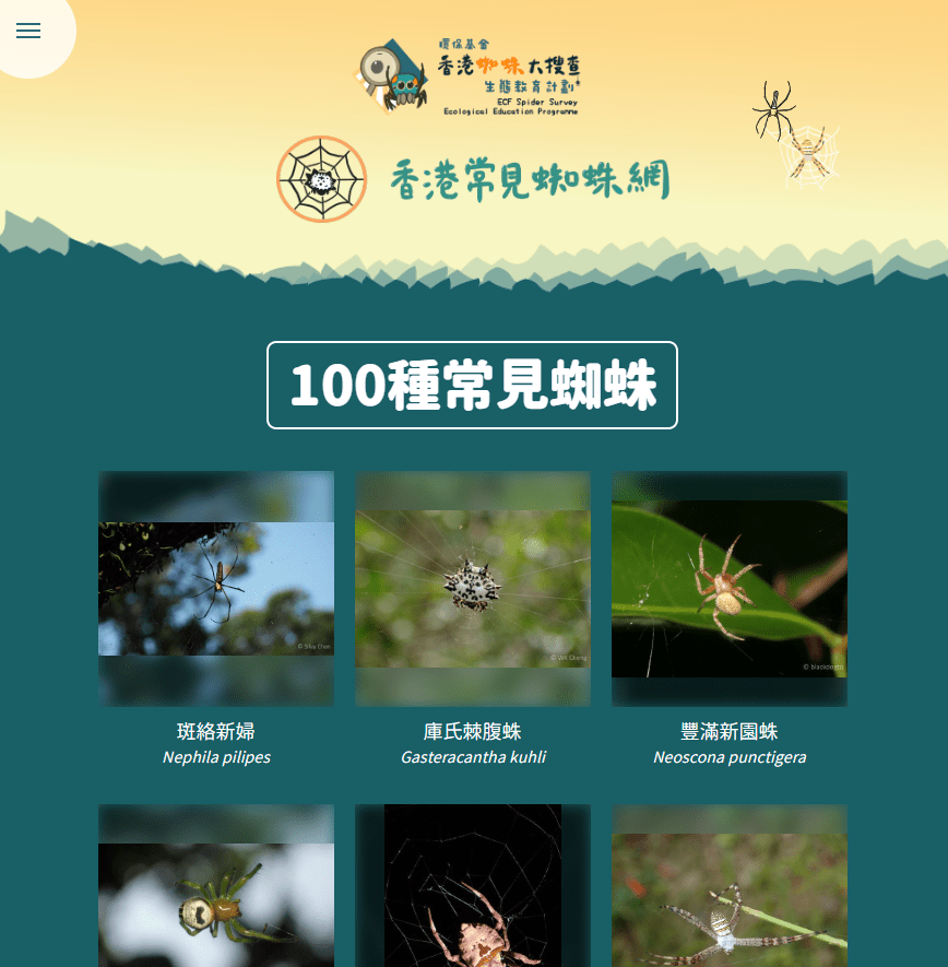 提供蜘蛛的生態知識及香港100種常見蜘蛛圖鑑,包含生境、辨認特徵等資訊