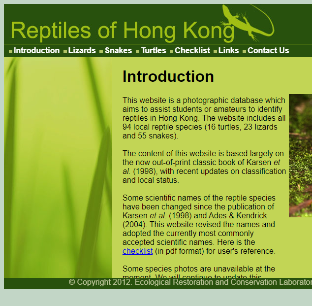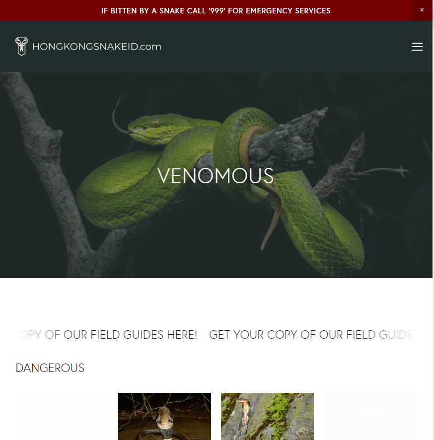 提供香港蛇類圖鑑,介紹每種蛇的生物知識,包括辨認特徵、毒性、大小、防禦行為等等